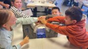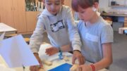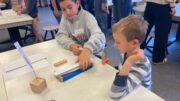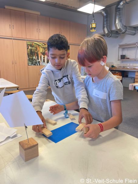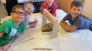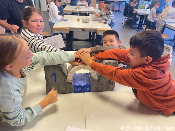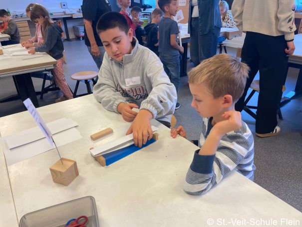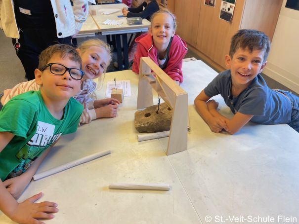 Am Morgen trafen wir uns um 7:50 Uhr an der Fleiner Grundschule und liefen gemeinsam zur Bushaltestelle. An der Experimenta angekommen machten wir eine kleine Vesperpause. Anschließend verstauten wir unsere Jacken und Rucksäcke in der Garderobe. Jedes Kind wurde einer Gruppe zugelost. Es gab insgesamt 6 Gruppen mit jeweils 4 Kindern. Drei Mitarbeitende der Experimenta unterstützten uns bei unserer Aufgabe, eine stabile Brücke zu bauen. Wir hatten Papier, eine Schnur, Kleber, Eisstiele aus Holz und Plastikröhrchen zur Verfügung. Jetzt mussten wir kreativ sein. Als wir fertig waren, probierten wir die Brücken mit einem Spielauto, das mit Schokolade beladen war, aus.