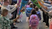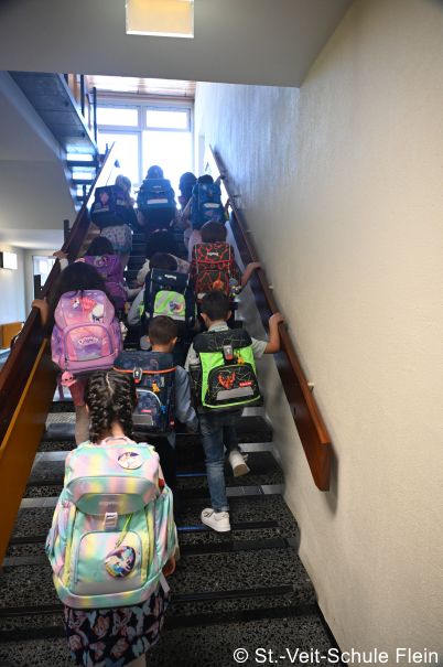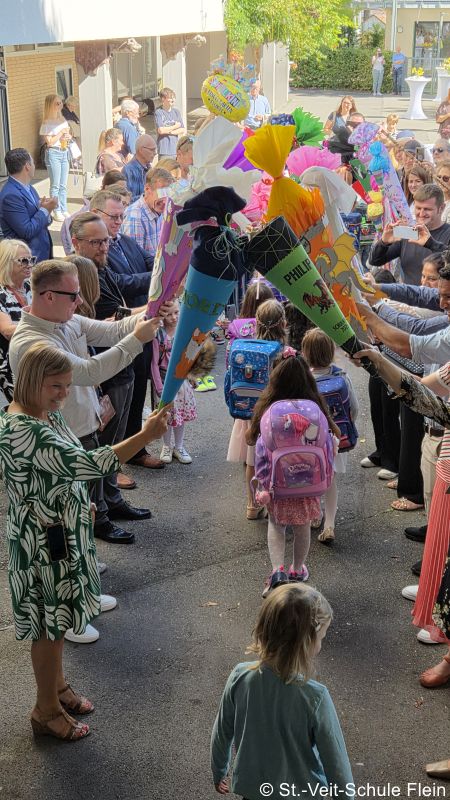 Pünktlich zum Fototermin vor dem eigens gestalteten Schulanfangsbogen, trafen die neuen Schüler*innen der St.-Veit-Schule ihre Eltern wieder auf dem Pausenhof.