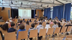 Am Donnerstag, den 19.03.2026 bekamen die Kinder Besuch von Annette Roeder. Die Autorin, die bei München lebt, empfing die Schülerinnen und Schüler im Musiksaal der St.-Veit-Schule. Als sich alle Kinder hingesetzt hatten, begann Frau Roeder über sich und ihre Bücher zu erzählen. Sie hat bereits über 30 Bücher für Kinder und Jugendliche geschrieben.