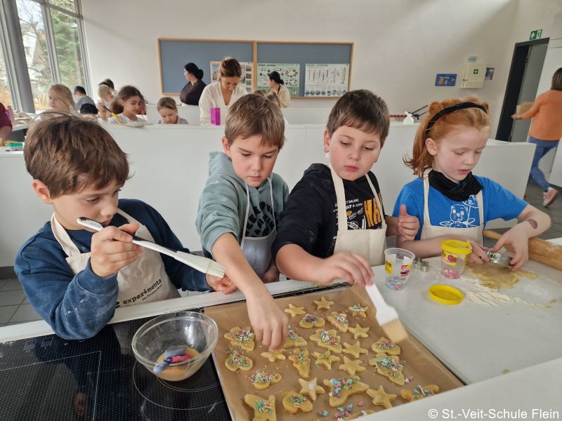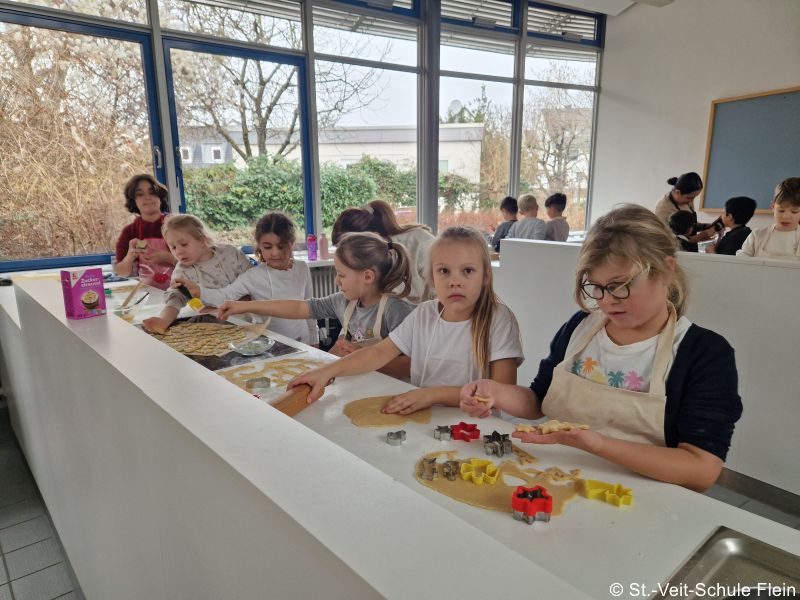 Jede Klasse hatte einen festgelegten Backtag, an dem die Schülerinnen und Schüler in der Schulküche tätig wurden. Unter der Anleitung der Lehrkräfte und helfender Eltern begannen die Kinder zunächst damit, den Teig zu kneten und auszuwalzen. Anschließend wurden mit großer Freude Plätzchen in verschiedenen Formen ausgestochen.