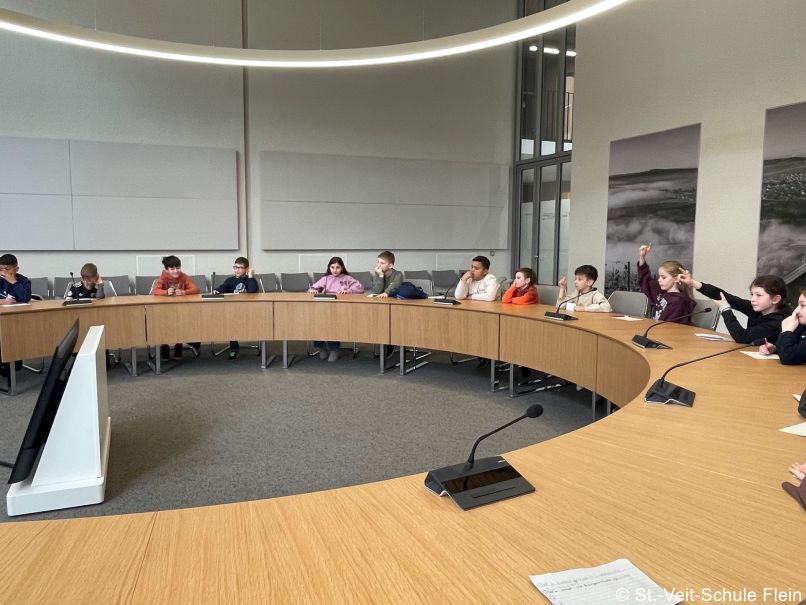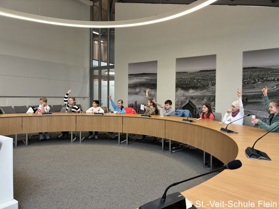 Anschließend durften alle Kinder dem Bürgermeister am großen runden Tisch, an dem sonst der Gemeinderat tagt, vorbereitete Fragen stellen, die er gerne beantwortete, z.B. „Was gefällt Ihnen am Beruf des Bürgermeisters so gut?“, „Wie wird man Bürgermeister?“, „Wie sind die Arbeitszeiten eines Bürgermeisters?“ oder „Haben Sie schon früher mal in einem Rathaus gearbeitet?“.